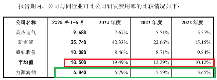 2022年度、2024年度、2025年上半年,力源海纳的研发费用率在同行中都是垫底。2023年,力源海纳的研发费用率略高于英杰电气。
