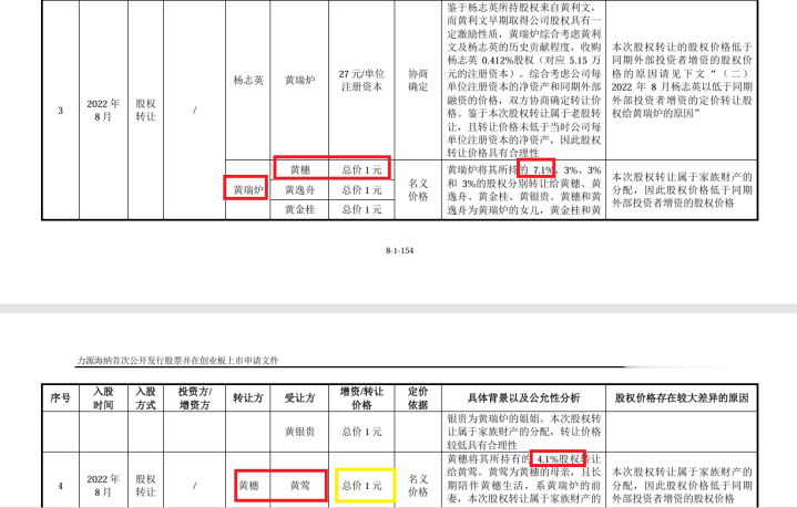 2022年8月23日,力源海纳实控人黄瑞炉的前妻黄莺(2006年5月离婚)以1元总价从其女黄穗处获得公司4.10%股权(对应51.25万元出资额)。彼时,力源海纳公允价值约为40元/出资额。这意味着,黄莺以1元的成本获得价值2000多万元的股份。